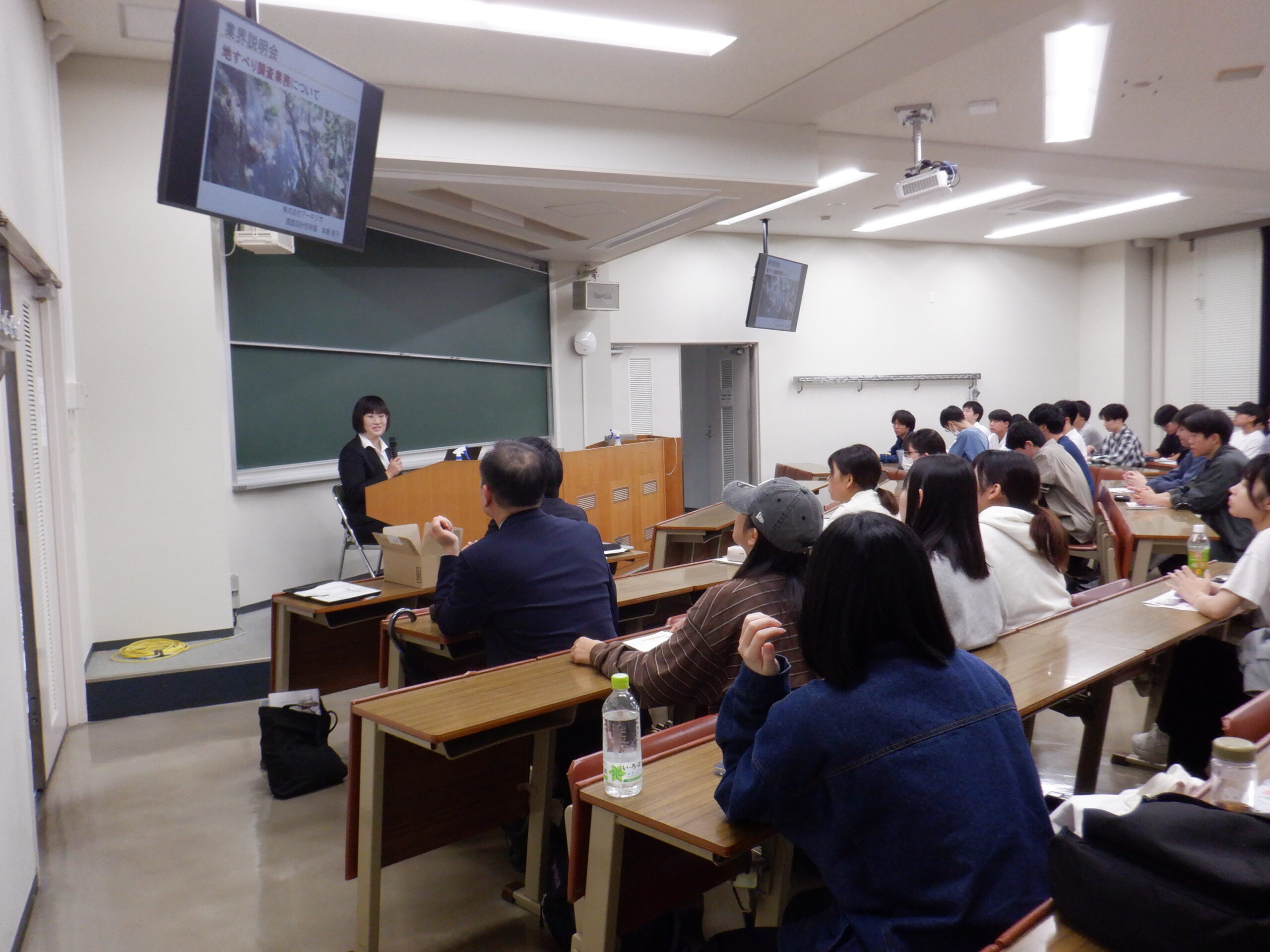 当日は、地質調査の現場での取り組みや、近年注目されている斜面災害への対策、そして実際に起こった事例についてご紹介しました。学生の皆さんは真剣に耳を傾けてくださり、質疑応答の時間には鋭い質問もいただきました。